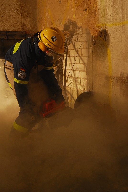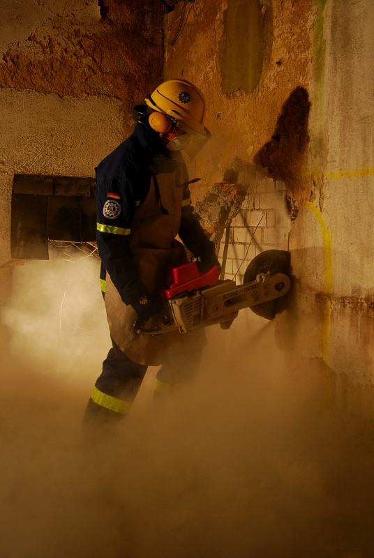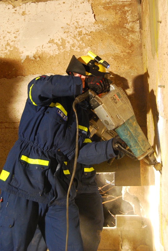Zu den Aufgaben der Bergungsgruppen gehört auch die Rettung verschütteter und eingeschlossener Personen, wofür man sich unter Umständen auch durch Beton und Mauerwerk beschädigter Gebäude arbeiten muss. Leider ergibt sich nicht allzu oft die Möglichkeit, sich beispielsweise an einen realen Mauerdurchbruch zu versuchen.